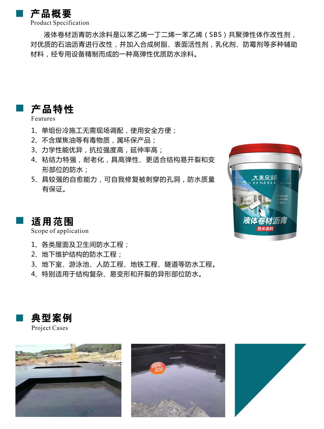 4、粘结力特强,耐老化,具高弹性、更适合结构易开裂和变形部位的防水;