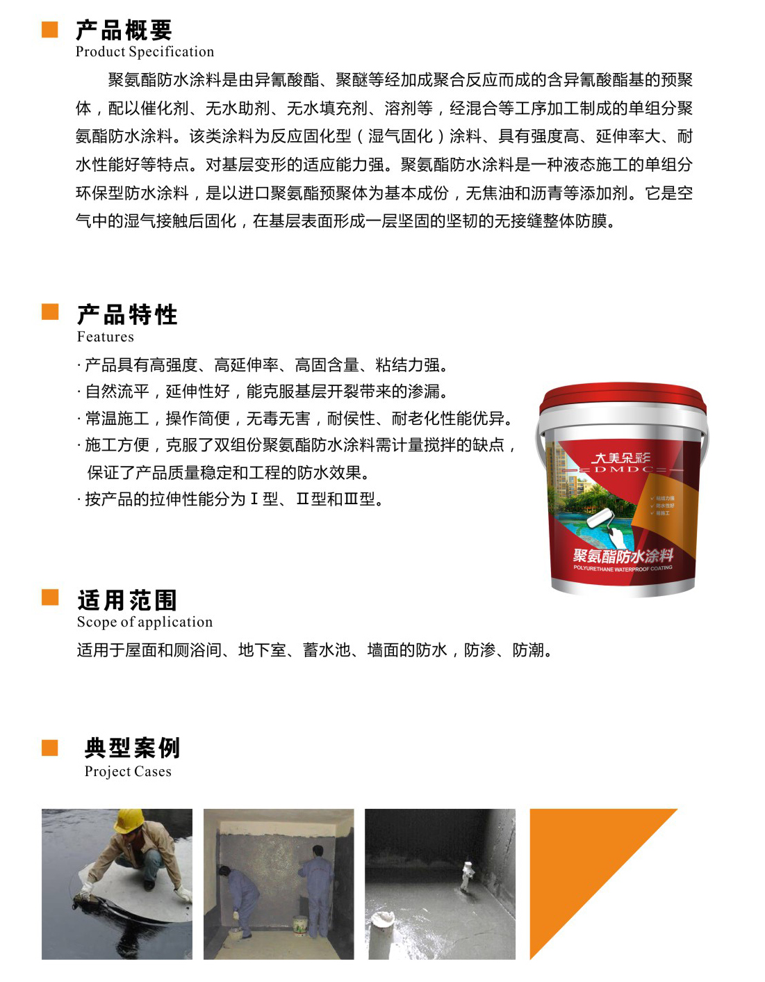 . 施工方便,克服了双组份聚氨酯防水涂料需计量搅拌的缺点,保证了产品质量稳定和工程的防水效果。